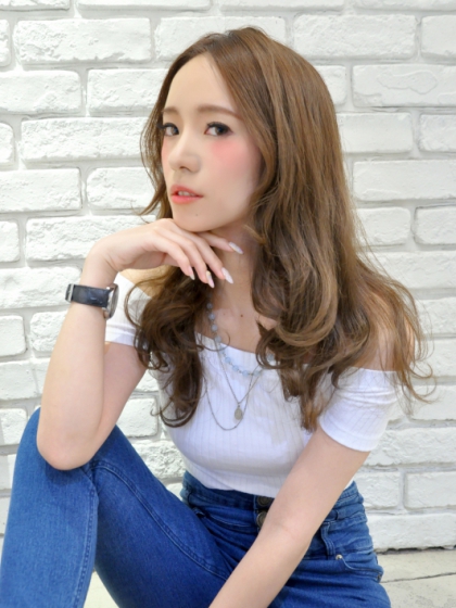 顔周りに沿うように作ったセンターバングがウレシイ小顔効果もあるのでオススメのスタイルです。カラーは赤みを押さえたヌーディーカラーを使いました